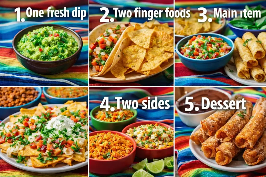 For example, you could serve guacamole, taquitos, mini nachos, Mexican rice, black beans, and churros. That combination feels full without becoming hard to manage.
